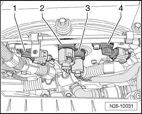 The camshaft adjustment is load- and RPM dependent. The electrical camshaft adjustment valves -1- switch oil pressure onto camshaft adjusters (mechanical adjustment mechanisms), which then adjust the camshafts.