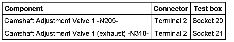 - Corresponding fuses on E-box in engine compartment, left side, for Camshaft Adjustment Valve 1 -N205- and Camshaft Adjustment Valve 1 (exhaust) -N318- must be OK.