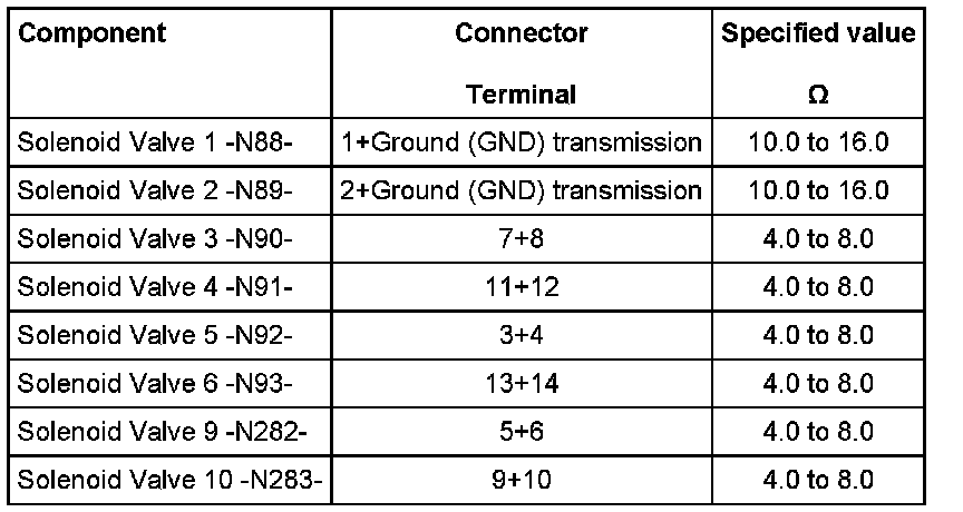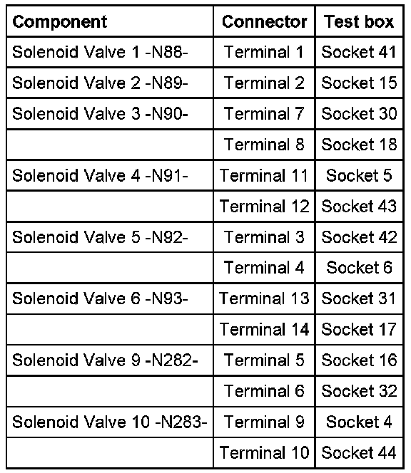 - Check resistances of solenoid valves at connector to the solenoid valves: