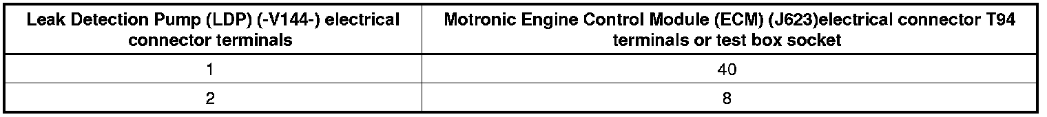 - Using a multimeter, check the Leak Detection Pump (LDP) (-V144-) electrical connector terminals to Motronic Engine Control Module (ECM) (J623) electrical connector T94 terminals for an open circuit.