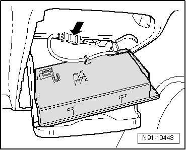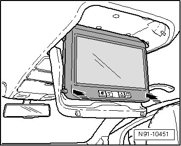 - Guide hook (VAS 3370) between monitor and cover in roof console and move it downward in - direction of arrow - until it contacts plastic monitor pins.