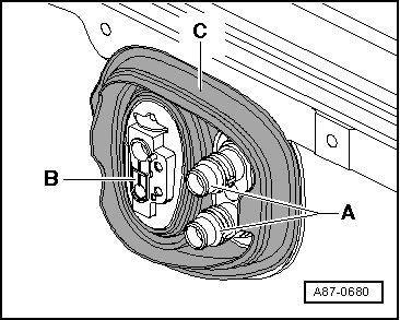 - Seal the flanges on the coolant pipes leading to the heater core - A - and for the expansion valve to the evaporator (only on vehicles with air conditioning) - B - at the pass-through of grommet - C -with silicon adhesive sealant if necessary, to prevent water from penetrating.