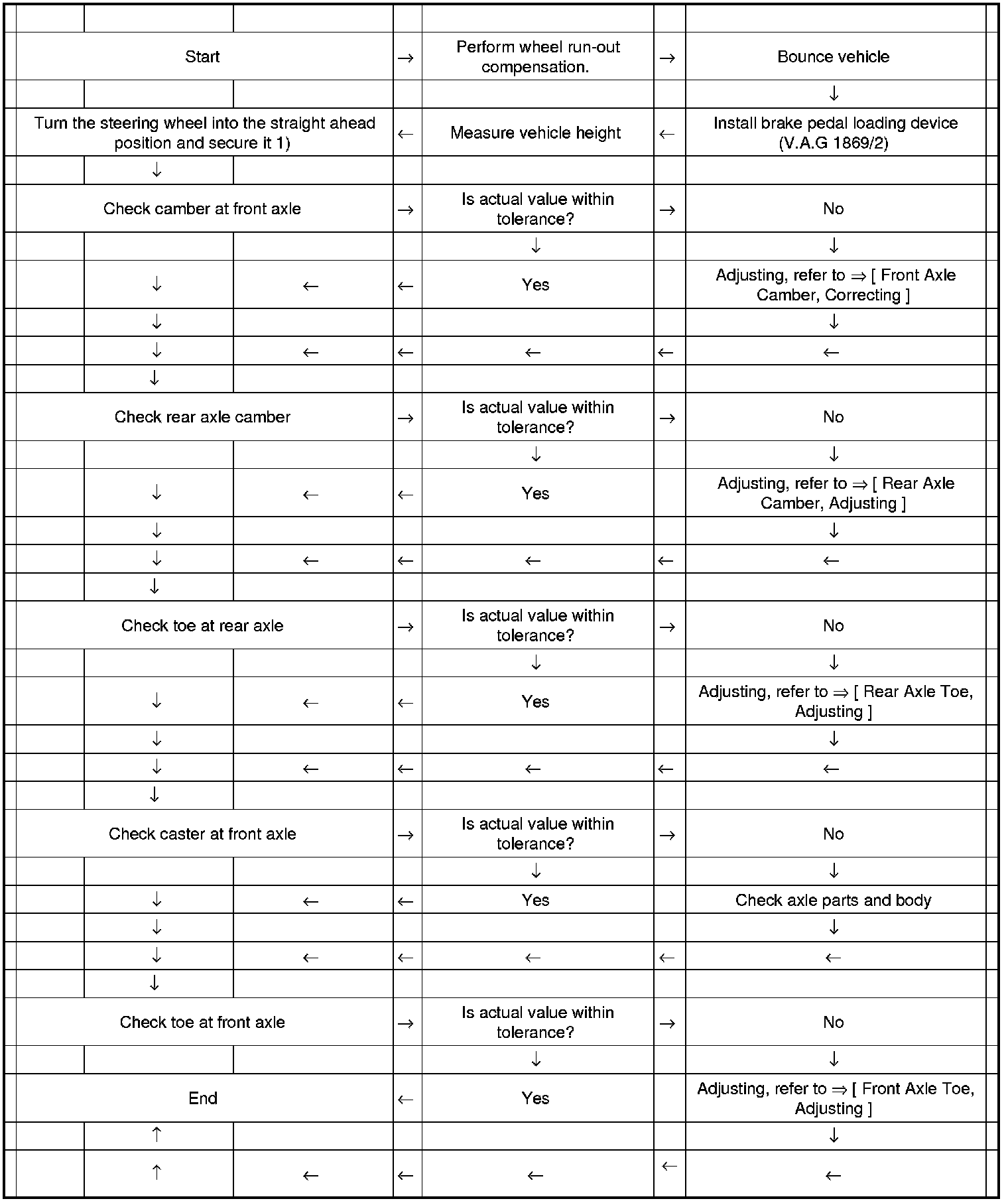 1) If steering wheel is crooked at end of alignment procedure, it must be straightened. Then perform basic setting for steering angle sensor (G85) using vehicle diagnosis, testing and information system (VAS 5051).