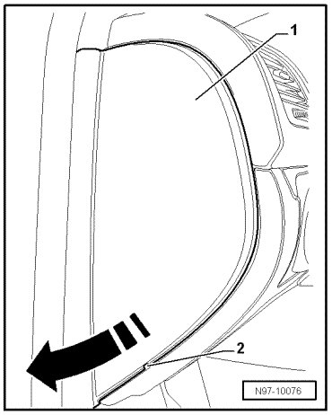 - Remove side cover - 1 - of instrument panel, do this by inserting trim removal wedge (VAS 3409) or a screwdriver into recess - 2 - and pry off cover - 1 - in - direction of arrow -.