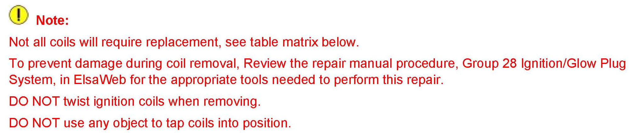 ^ If Misfire complaint is not corrected after the replacements of the ignition coils diagnose the condition and perform necessary repairs with the use of Guided Fault Finding, the repair manual and applicable Technical Bulletins.