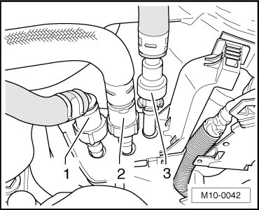 - Disconnect fuel supply line - 3 -. Press the circlip upward into the housing to release the line - 3 -.