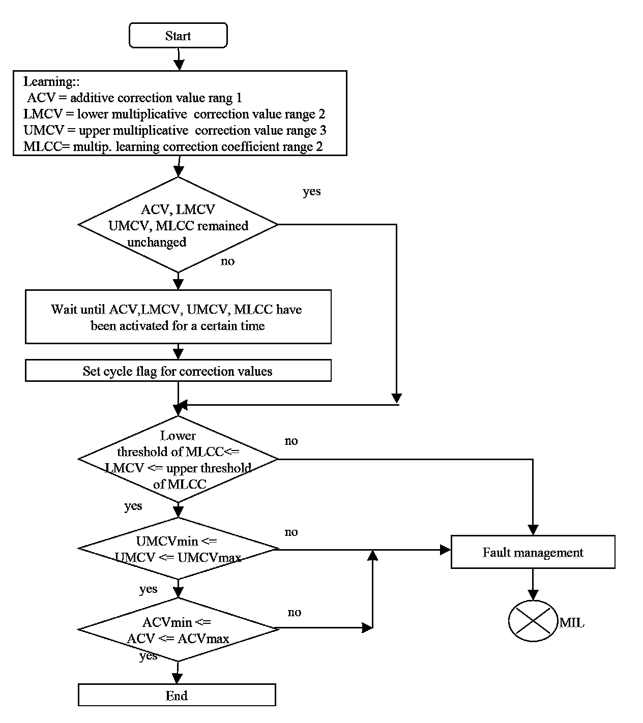 If the adaptive values exceed their plausible ranges, then the MIL is illuminated and the fault is stored.