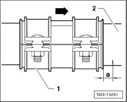- Align clamp - 1 - to marking on catalytic converter - 2 - .