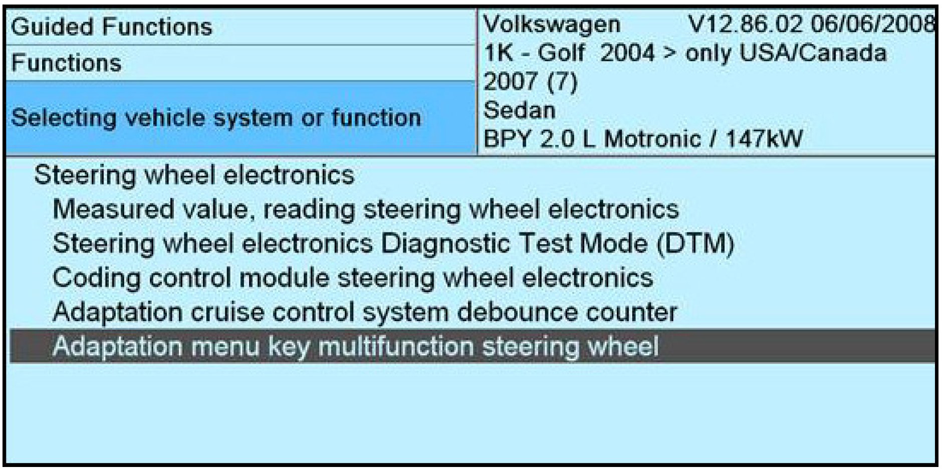 - Select "Operating Mode -> Guided Functions -> 16 - Steering Wheel Electronics -> Adaption menu key multifunction steering wheel".