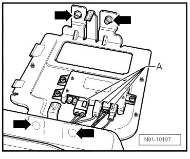 - Remove screws - arrows -, disconnect connectors - A - and remove bracket with antenna selection control module.