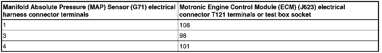 - Using a multimeter, check the Manifold Absolute Pressure (MAP) Sensor (G71) electrical harness connector terminals to the Motronic Engine Control Module (ECM) (J220) electrical harness connector T121 terminals for an open circuit.