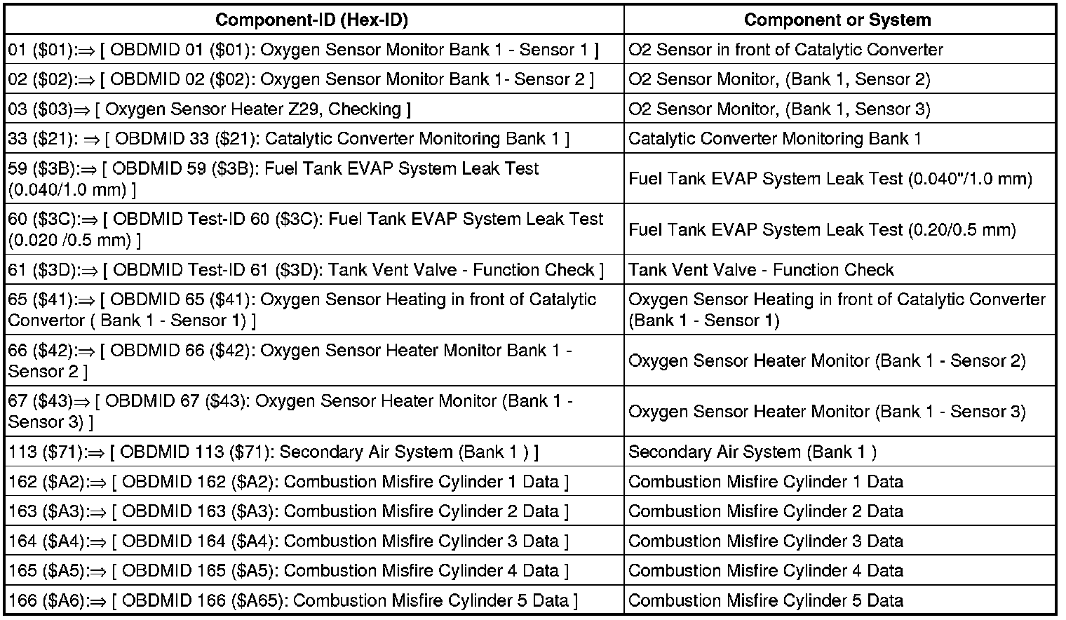 • Depending on scan tool and protocol used, the information in Diagnostic Mode 06 may be referred to by different names such as Test-ID (TID), Hex-ID, Component-ID (CID), or On-Board Diagnostic Monitor Identifier (OBDMID).