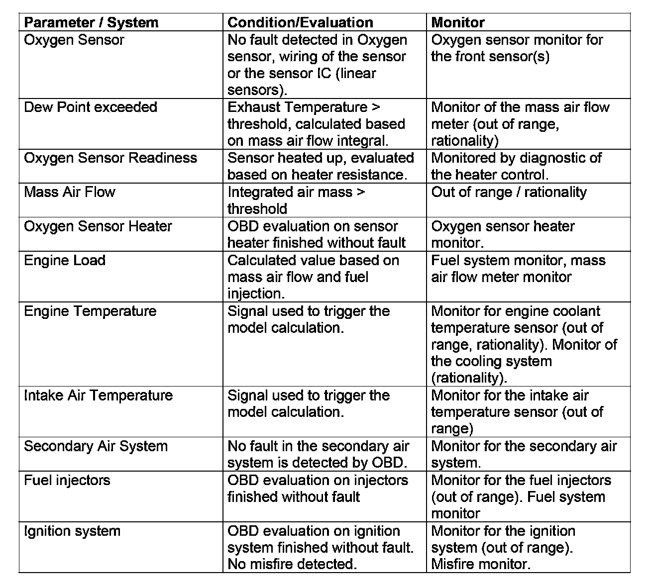 The main condition for closed loop is a proper heated up Oxygen sensor and the dew point must be exceeded. To guaranty the Oxygen sensor readiness the heat-up strategy starts depending on engine temperature first on a low level of heater power. Upon the exhaust temperature reaches a level where no liquid water is expected to be in the exhaust system the heater power is controlled to achieve normal ceramic temperature of the Oxygen sensor. The ceramic temperature has to be > 350 degrees C for binary and > 685 degrees C linear sensors. Specific temperatures are mentioned in the individual summary tables of the concepts.