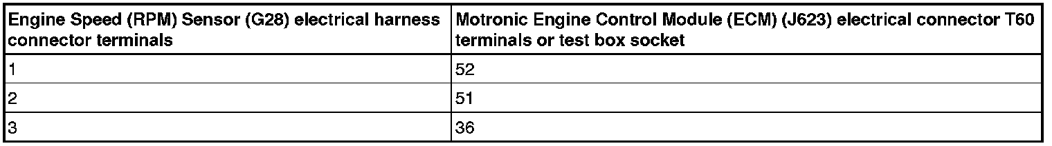 - Using a Multimeter, check the Engine Speed (RPM) Sensor (G28) electrical harness connector terminals to the Motronic Engine Control Module (ECM) (J623) electrical harness connector T60 terminals for an open circuit.