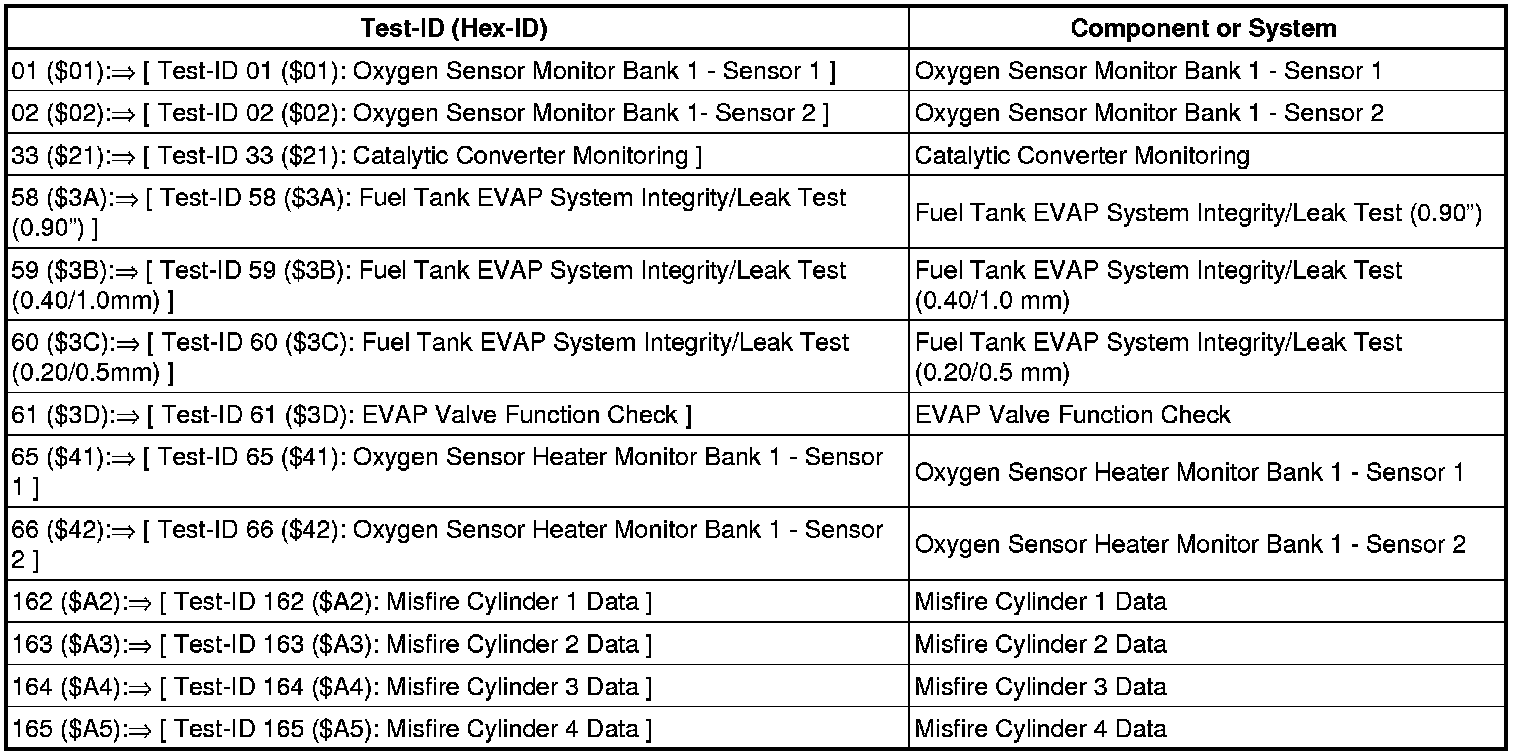 Depending on the scan tool and protocol used, the information displayed in Diagnostic Mode 06 may be referred to by different names such as Test-ID (CID), Hex-ID, Component-ID (CID), On-Board Diagnostic Monitor Identifier (OBDMID), or contain no name at all and may be referenced by only a number.