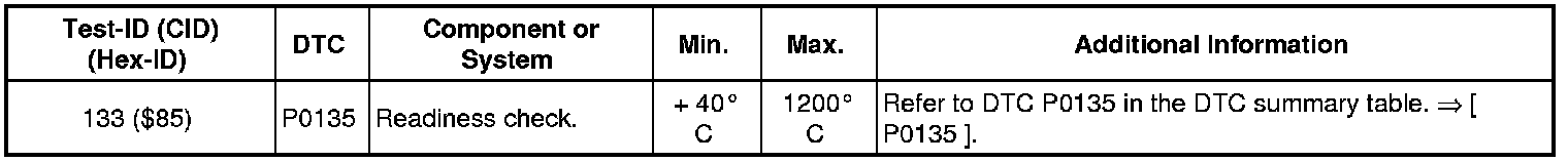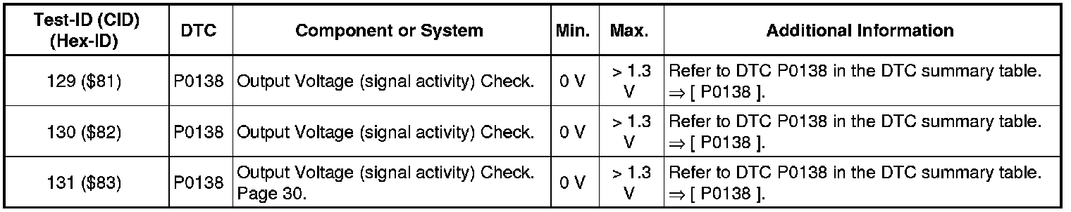 - If any of components or systems fail to meet the specified values. Refer to Diagnostic "Mode 03: Interrogating Fault Memory" to check for stored DTC's or the corresponding diagnostic repair procedure => [ Diagnostic Mode 03 - Read DTC Memory ] Diagnostic Mode 03 - Read DTC Memory.