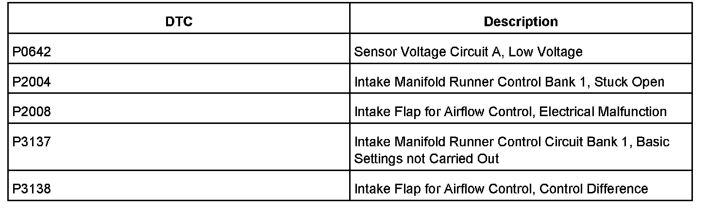 One or more of the DTCs in the table above may be stored in the ECM data memory.