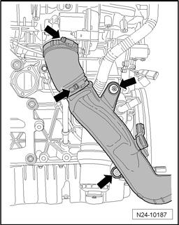 - Loosen bolts and clamps - arrows - and remove charge air pipe and hose downward.