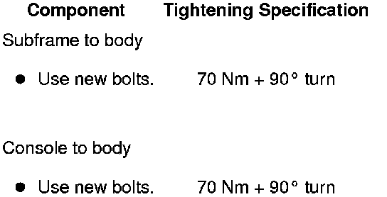 - Tighten subframe and brackets with new bolts on body to additional torque angle.