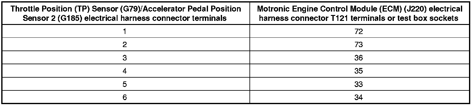 - Using a Multimeter, check the Throttle Position (TP) Sensor (G79)/Accelerator Pedal Position Sensor 2 (G185) electrical harness connector terminals to the Motronic Engine Control Module (ECM) (J220) electrical connector T121 for resistance.