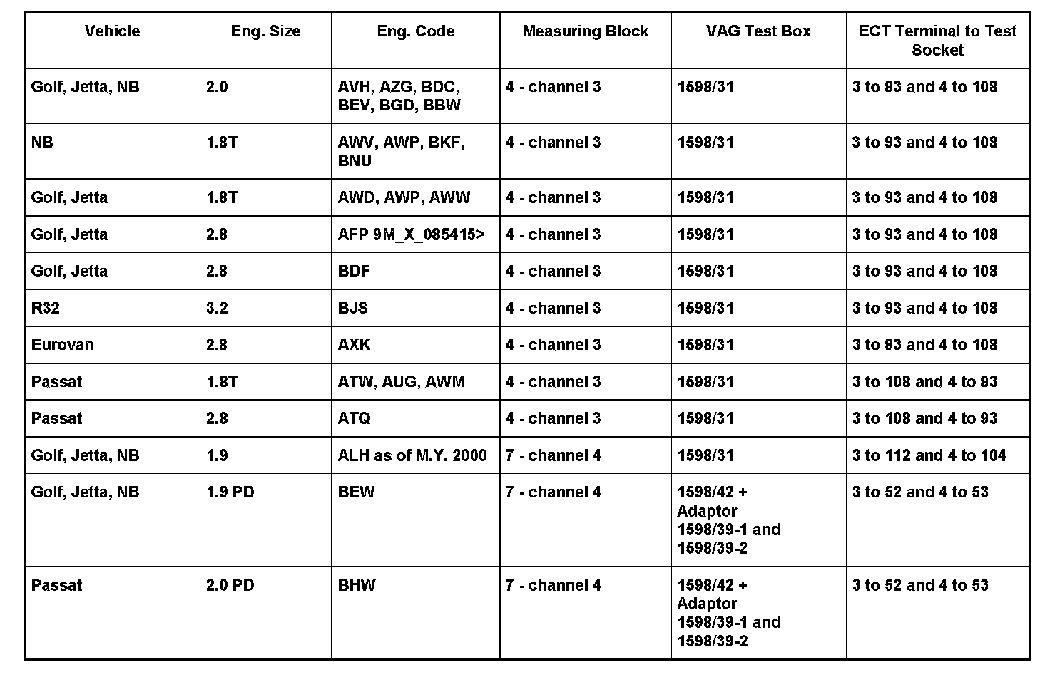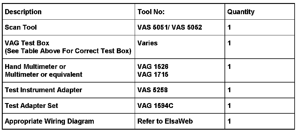 ^ Connect correct VAG 1598 test box, (as indicated in above table). See Service, to control module wiring harness. Engine control module is not connected by this action.