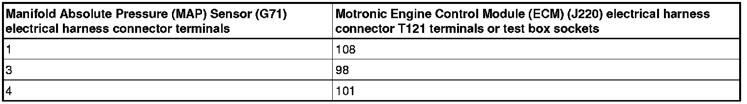 - Using a multimeter, check the Manifold Absolute Pressure (MAP) Sensor (G71) electrical harness connector terminals to the Motronic Engine Control Module (ECM) (J220) electrical harness connector T121 terminals for resistance.