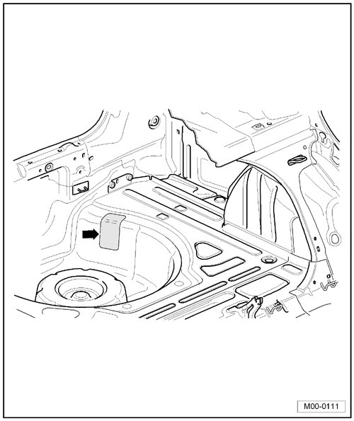 Vehicle data plate - arrow - is secured in spare wheel well on left side in direction of travel.