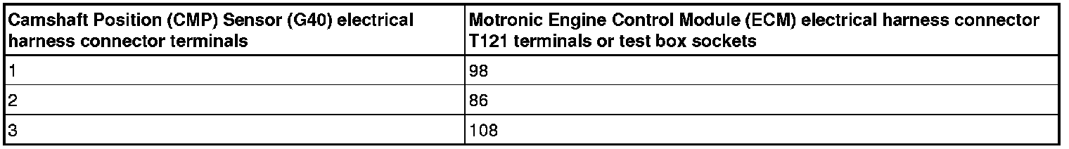- Using a multimeter, Check the Camshaft Position (CMP) Sensor (G40) electrical harness connector to the Motronic Engine Control Module (ECM) electrical harness connector T121 for an open circuit.