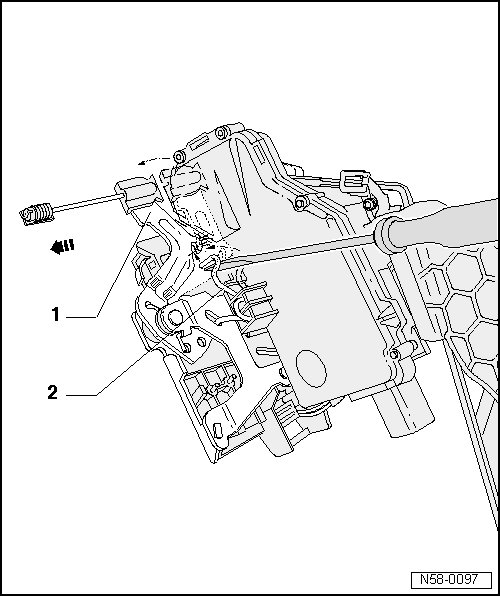 - Remove bolt - 1 - and unhook wiring harness guide - 2 - from door.