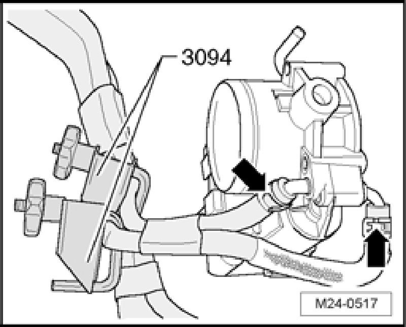 - Clamp off coolant hoses using Hose Clamps Up to 25 mm dia. 3094 and disconnect them from throttle valve connection - arrows -.