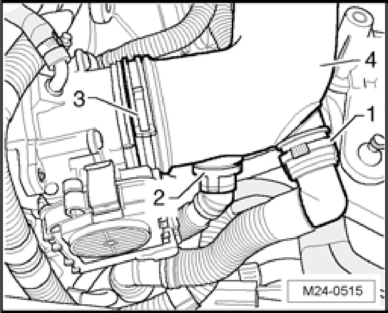 - Remove intake hose - 4 - between Throttle Valve Control Module J338 and Mass Air Flow (MAF) Sensor G70. To do so, disconnect air hoses - 1 - and - 2 - (compress securing ring) and remove spring clamp - 3 -.