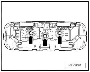 - Disengage retainers - arrows - and remove panel with diffusion lens from interior and reading lights.