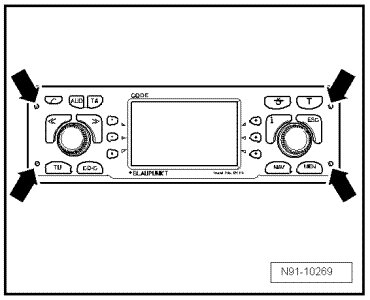 - Press locking mechanism on both sides of radio navigation system - arrow - and remove release bracket.