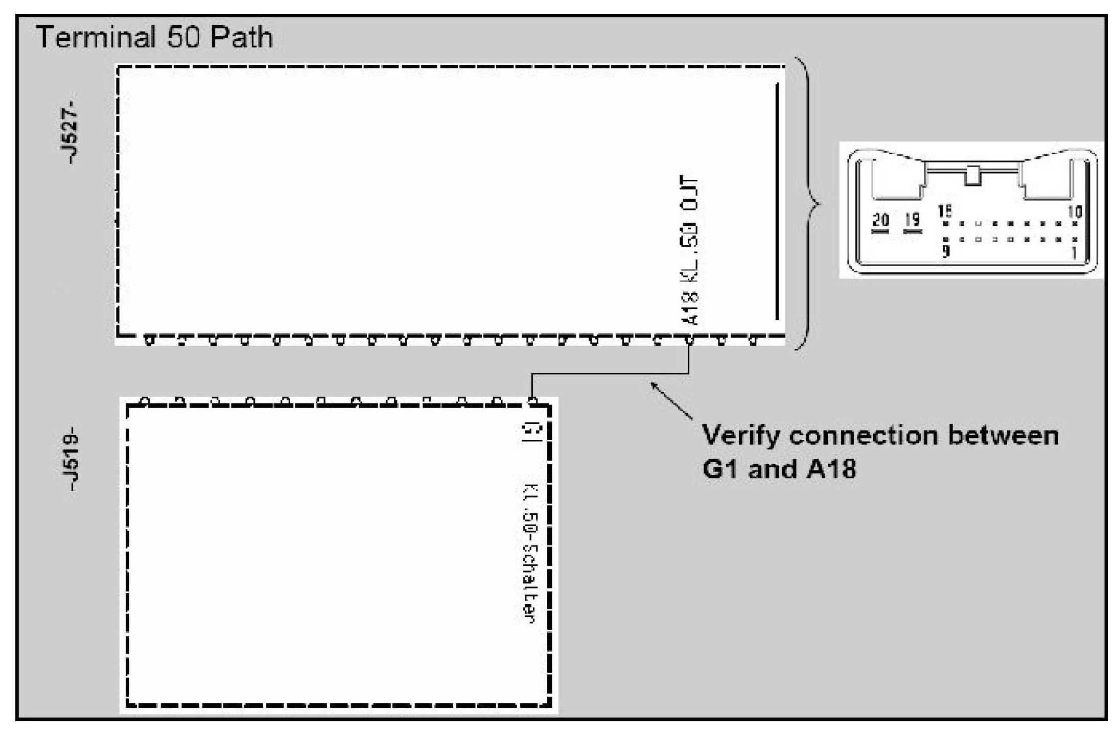 May be caused internally when the Steering Column Electronic Systems Control Module -J527- fails, this causes Terminal 50 to not energize high, which results in a no crank condition.