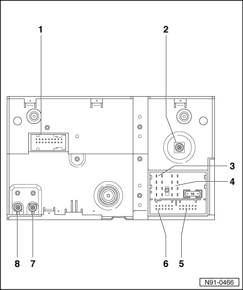 Antenna signal input via connection 1 is tested in radio navigation system and result is output to antenna selection control module via connection 2. Function is switched to another antenna when antenna signal is determined to be weak (diversity). This procedure is not audible to the customer.