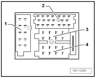 • Multi-pin connector "4" for Gala, telephone, voltage supply. Refer to => [ Connector 4 Contact Assignment ] Connector 4 Contact Assignment