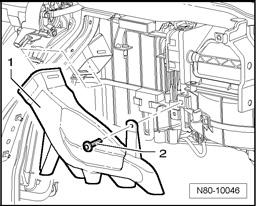 - Lift floor carpet, unclip rear channel from floor and pull off from heating and ventilation unit -arrow-.