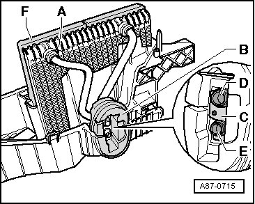 - When inserting evaporator - A - into lower section of evaporator housing and when assembling both housing halves, ensure seal - F - is not damaged.