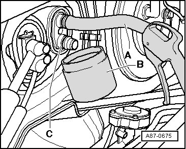- Seal the flanges on the coolant pipes leading to the heater core - A - and for the expansion valve to the evaporator (only on vehicles with air conditioning) - B - at the pass-through of grommet - C -with silicon adhesive sealant if necessary, to prevent water from penetrating.