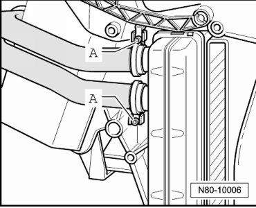 - Check seating of both clamps - A - after tightening screws. They must completely enclose the flange on the heat exchanger and coolant pipe and must not come in contact with other components.