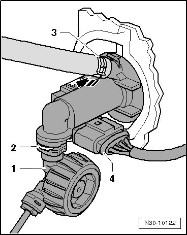 - Press the hose/line assembly - 1 - and seal - 2 - into the clutch master cylinder connection - 4 - until the clip - 3 - clicks into place.