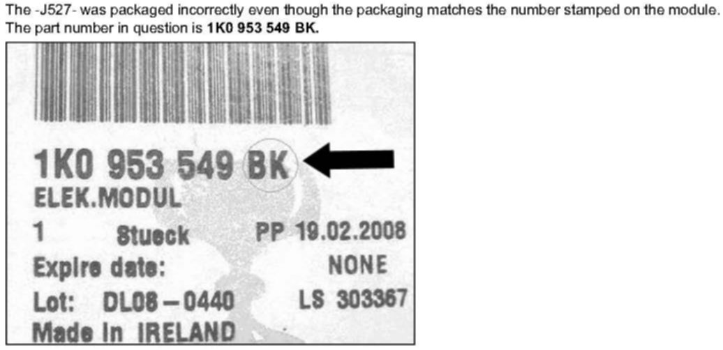 ^ Review part number in upper right hand of screen to verify the index is Not "AM". If "AM" is shown, replace the -J527-.