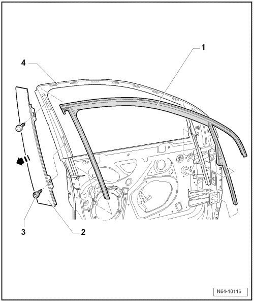 - Pull window guide - 1 - all around from window frame - 4 - and upward out of window shaft.