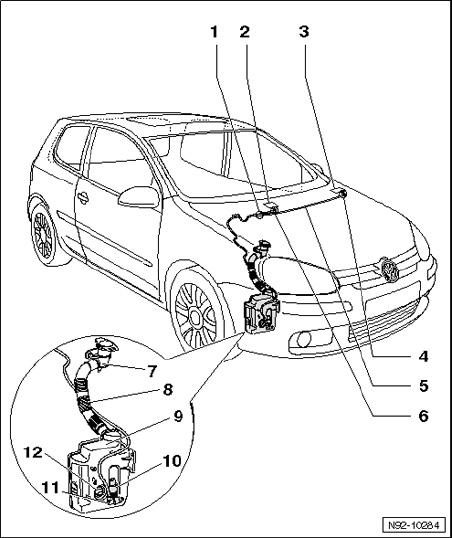 NOTE: Two different versions of reservoir for windshield washer and headlamp cleaning systems are installed, depending on equipment. Illustration shows the version for vehicles without parking heater.