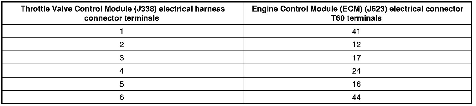 - Using a multimeter, check the Throttle Drive for Electronic Power Control (EPC) (G186) at Throttle Valve Control Module (J338) electrical harness connector terminals to the Engine Control Module (ECM) (J623) electrical harness connector T60 terminals for a short to ground or an open circuit according to the chart below.