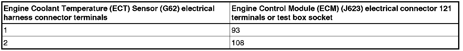 - Using a multimeter, check the Engine Coolant Temperature (ECT) Sensor (G62) electrical harness connector terminals to the Engine Control Module (ECM) (J623) electrical harness connector T121 terminals for resistance.