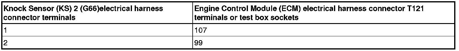 - Using a multimeter, Check the Knock Sensor (KS) 2 (G66) electrical harness connector to the Engine Control Module (ECM) (J623) electrical harness connector T121 for resistance.