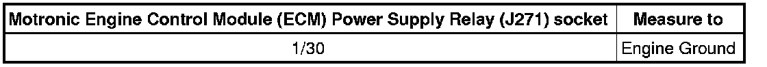 - Check the Motronic Engine Control Module (ECM) Power Supply Relay (J271) socket 3/86 to Battery positive for an open circuit, high resistance, or short to Ground.