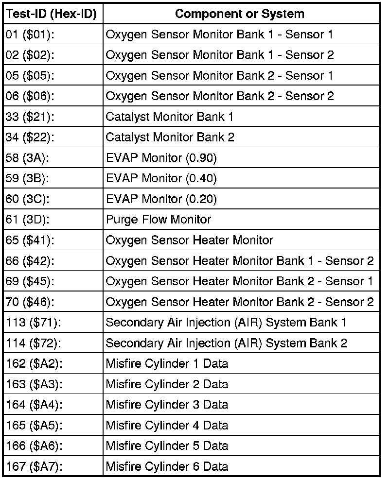 • Depending on the scan tool and protocol used, the information displayed in diagnostic mode 06 may be referred to by different names such as Test-ID, Hex-ID or On-Board Diagnostic Monitor Identifier (OBDMID).