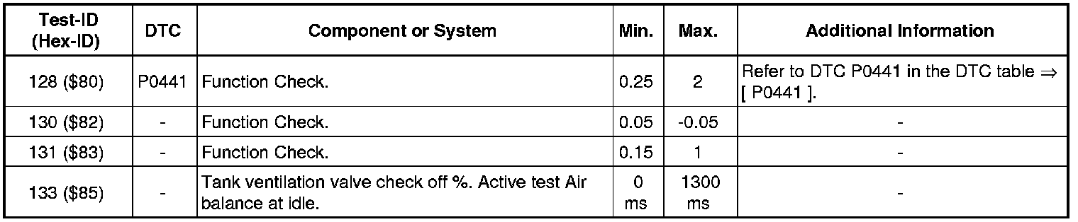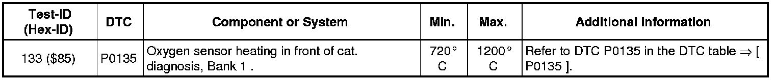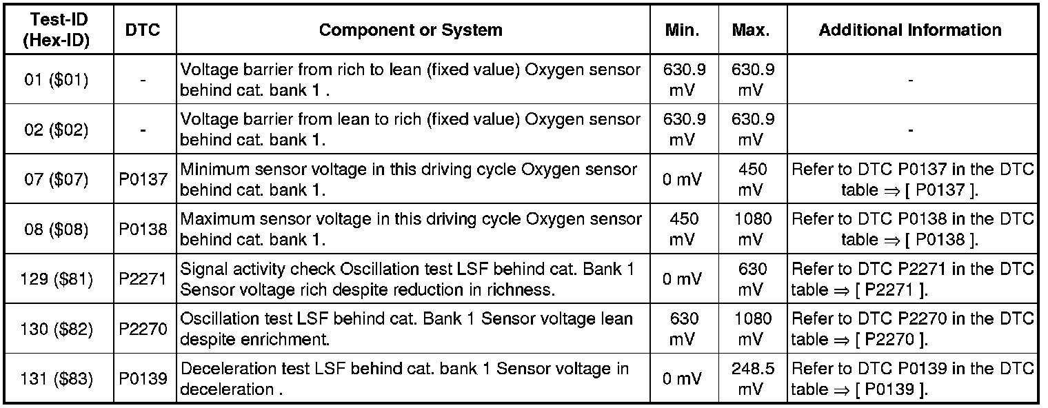 - If any of components or systems fail to meet the specified values. Refer to Diagnostic "Mode 03: Interrogating Fault Memory" to check for stored DTC's or the corresponding diagnostic repair procedure => [ Diagnostic Mode 03 - Read DTC Memory ].